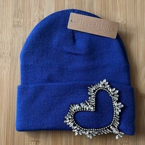 Brand New Steve Madden Blue Knit Beanie Hat w/ Rhinestone Beaded Heart. Pretty & eye-catching!