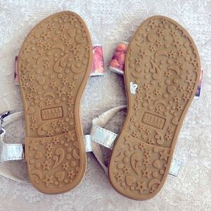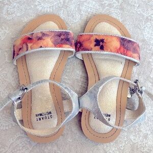 Brand New Stuart Weitzman Floral Metallic Iridescent Ankle Strap Sandals w/ Heart Charm at Buckle. Girls size 10. No box. Super cute!