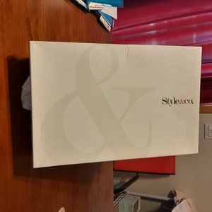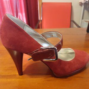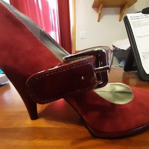 These brand-new Style & Co. dark red suede closed-toe heels have a rounded toe and a red patent leather adjustable strap. The buckle is silver. There is a slight platform at the toe/ball of the foot area. It's 1/2 inches. The heel is cone-shaped and is 4 inches. They have padding in the ball of the foot area. They would be perfect for a little black dress, adding a pop of color, to wear on date night, or even to work with slacks. The come with their original box and have never been worn.