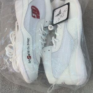 Stylish white high-top sneakers with red accents. Features a unique design with 'Drive to Sur5ive' branding.