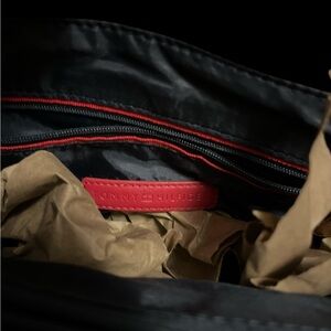 This bag is beautiful! So elegant by Tommy Hilfiger. Brown and Beige with leather handles. A center zippered compartment. Open on other two sides. Navy and Red insides. Handles only. Grab this one! 12”w 10” H Smoke free home!