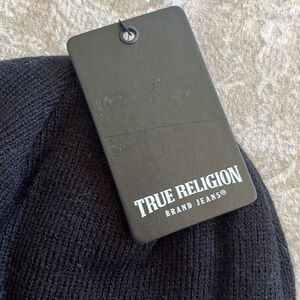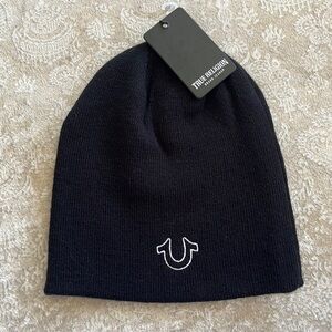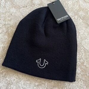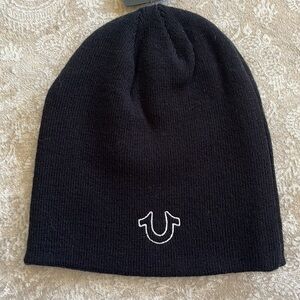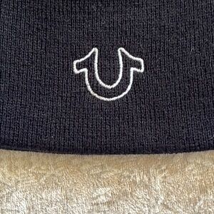 Brand New True Religion Black Embroidered White Logo Knit Beanie Cap Stretch Hat. Great look for him!