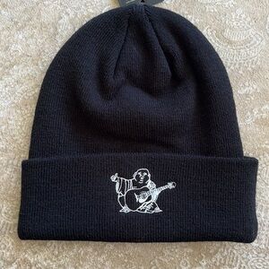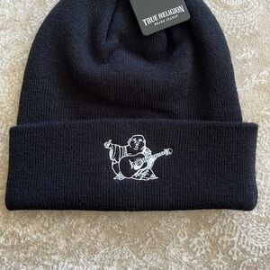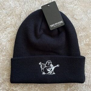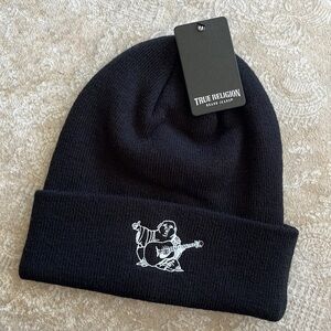 Brand New True Religion Black Knit Beanie Cap Stretch Cuffed Hat Embroidered Buddha. Great look for him!