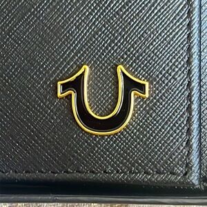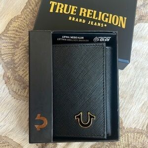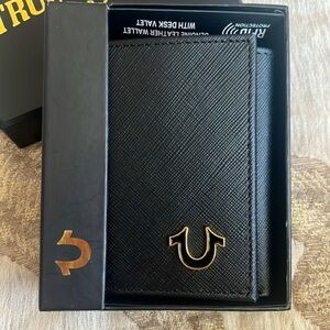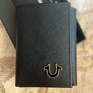Brand New True Religion Genuine Leather Black/Gold Trifold Pria Wallet RFID Protection w/ Desk Valet.