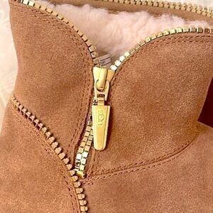 Brand New UGG Mini Florence Slip On Sheepskin Wool Boots Chestnut w/ Gold Tone
