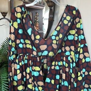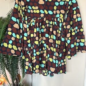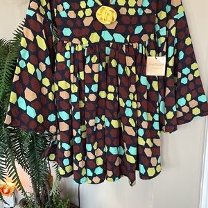 Brand New Unique Vintage Smak Parlour Brown Yellow Geometric 70s Mod Dress w/ Bell Sleeves.