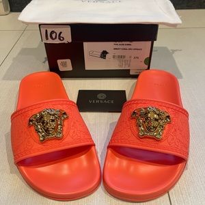 Hi!! I am selling these brand new Versace Gomma Pool Slide in Bright Coral size 37 or 7. These are Womens Sandals brand new in the box and this listing comes with the shoes, original box, dust bag and authenticity card.