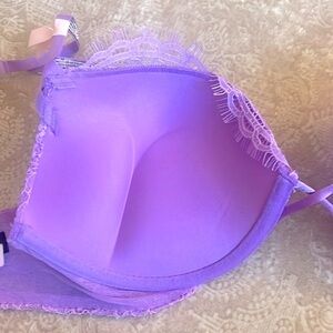Brand New Victoria’s Secret Bombshell Plunge Lace Double Shine Strap Purple Bra. Push up — adds 2 cup sizes. Size 34C. So pretty!