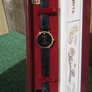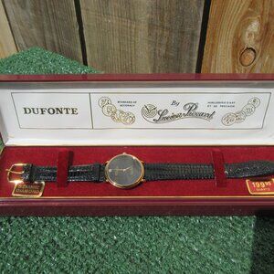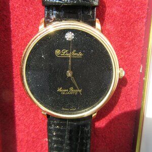I am selling a Brand New Vintage Dufonte By Lucien Piccard Genuine Diamond Men's Wristwatch. It is brand new and has never been worn. The watch has a black band. The face of the watch is black. It has a genuine diamond on the face. It comes in the original display box and the original box it came in.