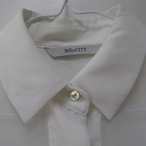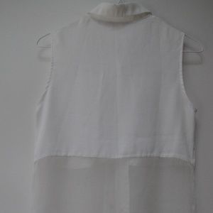 Casual chiffon, collared shirt with a translucent bottom half. Has a minor manufactured tear & stain