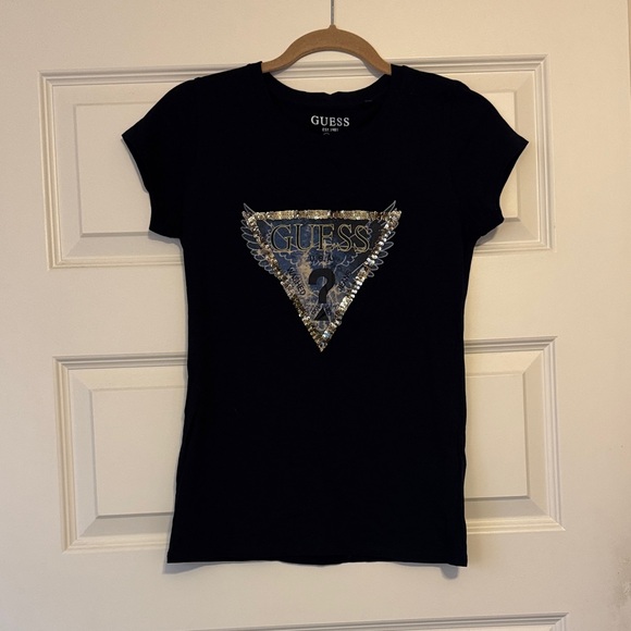 Brand New Without Tags GUESS Women's Black Tee with Silver and Blue Graphic