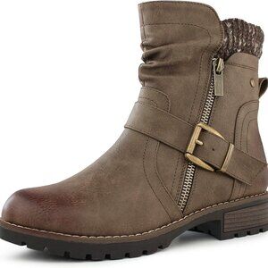 Features: These stylish combat boots feature textured synthetic leather uppers with a round toe, giving you a sleek look that’s perfect for both casual and dressier outfits. The ultra-soft padded collar and plush faux fur lining keep your feet warm and comfortable, while the zip-up design with decorative buckle straps adds a trendy touch. The 1.3-inch heel, 0.6-inch platform, and durable TPR rubber outsole make walking on slippery or uneven surfaces safe and steady.
