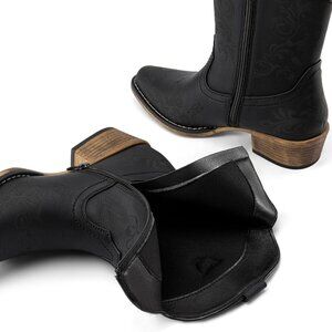 Features: These stylish ankle boots have a retro square toe that’s comfortable and chic, with a vintage engraved pattern on vegan faux leather giving off classic Cowgirl vibes. Easy to slip on thanks to the side zipper, and riding on a lightweight TPR outsole with a cute 1.38-inch cuban heel for just enough lift. The ankle shaft sits comfortably at 17 cm around, making these versatile and fun for various outfits.