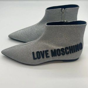 Brand New Women's Sz 38 M Love Moschino Argento Glitter Pointed Toe Booties