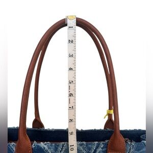This beautiful bag features a classic blue jean color and elegant brown leather braided handles. With a handle drop of 10 inches, it offers comfortable carrying. The bag measures 13 inches in height, 17 inches in width, and 7 inches in depth, providing ample space for all your essentials. Perfect for everyday use or as a chic accessory for any outfit.
