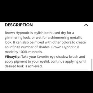 Brown Hypnotic is stylish both used dry for a glimmering look, or wet for a shimmering metallic look. It can also be mixed with other colors to create an infinite number of shades. Brown Hypnotic is made by 100% minerals.