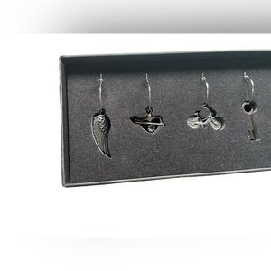 Each charm has a gorgeous antique silver color and is made of zinc alloy. The six charms include: an angel wing, heart with an arrow, a bicycle, a key, a dragonfly and a tree and come in a giftable, Splash-branded, black box.