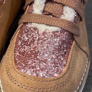 Top of shoe has rose gold glitter and inside is lined with faux shearling