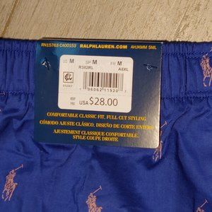 Brand New with Tags -Men's Polo Ralph Lauren Allover Pony Boxer Blue/Pink Medium. New with tags and never worn. Measures 14 1/2 (29) inches wide at waist unstretched with a 5 1/2 inch inseam. Measurements are approximate and taken when the garment is laying flat. 100% Cotton. Machine wash cold with like colors.