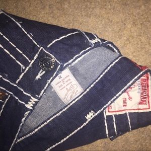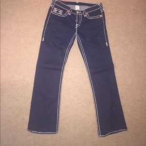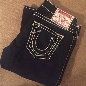 Brand New without tags True Religion Jeans with bold white stitching. Small white stitching lose but not bad. Never worn. Straight boot cut. 34 inseam and waist 32. These jeans are amazing!