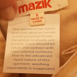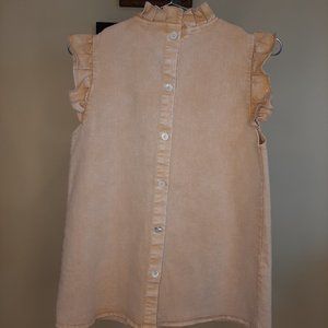 M074. Distressed gold wash on this trapeze style sleeveless ruffle top from boutique brand MAZIK! Full button back, curved hem, ruffle collar & ruffle semi-cap top sleeve, pleated front that drops to hemline to skim the hips. Super flattering! Extra button. Brand new with tags!!