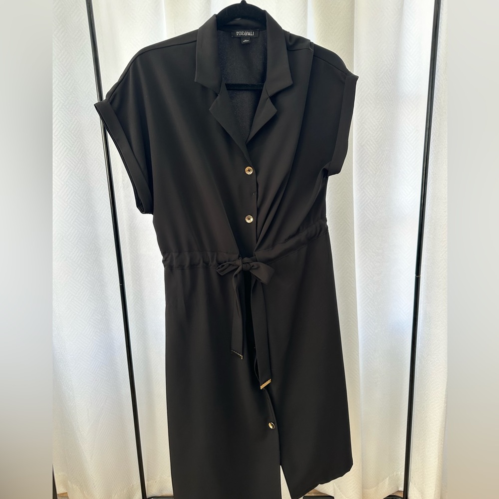 A perfect black dress with gold button details and a tie at the waist to accentuate your curves