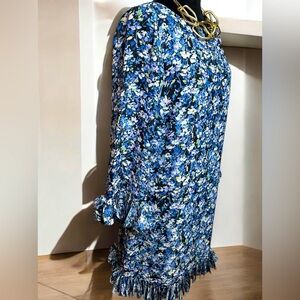 new dress, size 4, floral, with a design on the sleeves and ruffle.