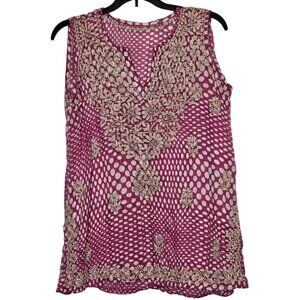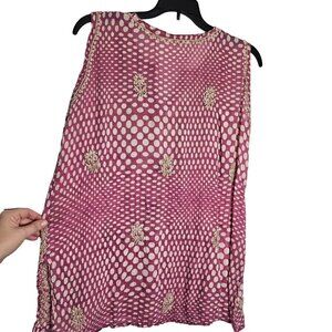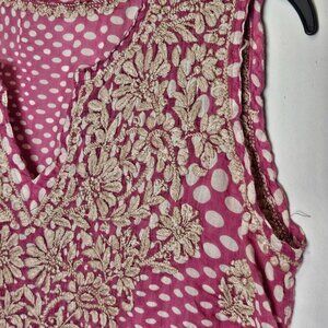 Brand Unknown Sleeveless Pink Polka Dot Top With Floral Tan Embroidery sz Medium