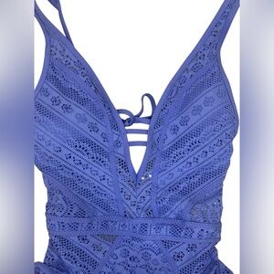 Dive into style with this elegant blue lace one-piece swimsuit. Perfect for a chic beach look.