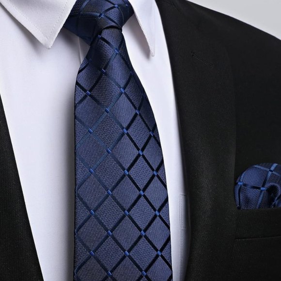 Fantastic option for any formal event! Includes the tie, a matching pocket square, and 1 clip. The tie measures 3.4" x 59". This navy blue geometric tie is soft and lightweight, made with microfibre material.