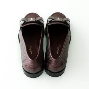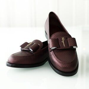 Salvatore Ferragamo Ladies Loafers. SKU: 01C952 757688. Color: Purple. Shoe Style: Slip-On. Vamp Style: Metal Hardware. Upper Material: Leather. Salvatore Ferragamo Vivaldo Viva Leather Loafers. The Viva loafer features a slip-on style, a maxi bow embellishment, a leather sole and a 1 cm heel. Made in Italy.