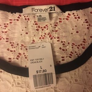 Brand new forever 21 lace blouse in size Large! It's never been worn and in good condition. The sleeves go about halfway down the top half of the arm before the elbow. Perfect for wearing over a color tank top since it is see through :) let me know if you have any questions!!
