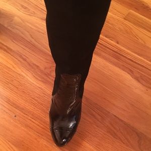 Francesco Morichetti Black crinkled patent leather & lush suede combine in a striking look on a slightly round/pointy toe boot.