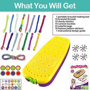 What’s inside: 1 portable bracelet loom, 33 colorful pegs, 15 bracelet threads, 15 sturdy elastics, 15 cartoon buckles, 18 fashion pattern stickers, 1 instructional guide, all in a beautiful box, great gifts ideas for girls, cool toy for tween and teens to have fun and promote relationship.