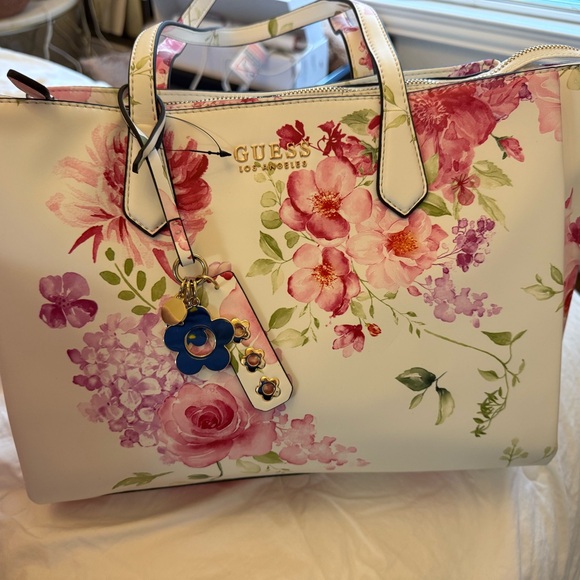 Brand new Jennice satchel bag. Chic GUESS tote with pink floral design. Perfect for everyday elegance. Stylish and functional.