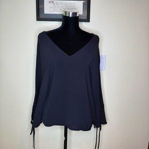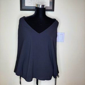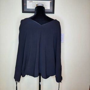 M048. This gorgeous black top from Gee Gee (boutique brand) has exaggerated raglan sleeves with a slit & ties, a defined waist for a slimming silhouette &