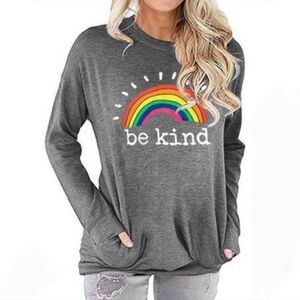 Super soft and lightweight shirt/ sweatshirt. Rainbow graphic on the front with “be kind” lettering.