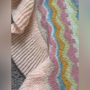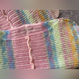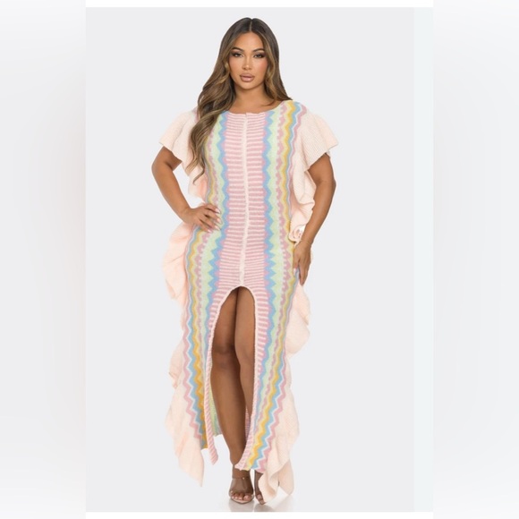 Brand new ruffle knit multicolor zigzag patterned sweater dress. Perfect for any occasion, this dress features a playful mix of colors and the ruffles add a fun touch to your wardrobe.