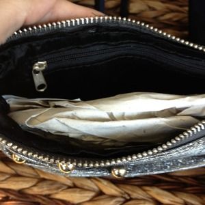 This super cute and trendy clutch is 8.5x5.5 with a zipper closure and wristlets strap. 3 straight metal barbells accent the front. The inside has a separate zip pocket to secure things like cash, credit card and ID. This would look great with jeans or with your little black dress.