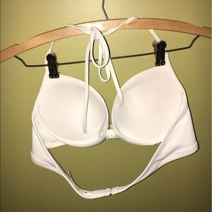 Never worn. Bought last summer and never wore it. You can see that there is no sign of wear because it's a white top. Fits cup size A-C