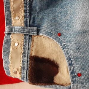 Adorable red tee with a horse print. Stylish denim shorts with red bandana accents.