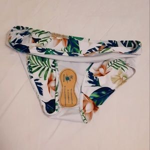 Never worn. Pretty tropical print in green, blue and a peachy brown on a white background. Silky smooth to the touch. Full coverage. Covers belly; hits at waist. Fits more on the large side imo.