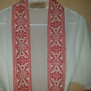 White and red short cardigan with belt.