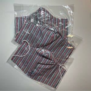 These three masks are reversible. One side is striped with red white, navy blue and light blue. The back sides are two dark navy blue and one red.