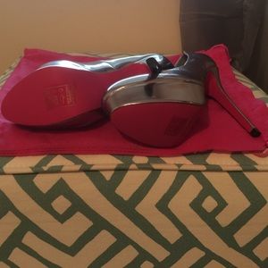 Brand new, never been worn metallic silver stilettos. Comes with the dust bag.