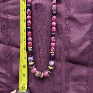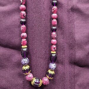 The product is a stylish beaded necklace featuring a variety of purple beads. The necklace is designed to add a pop of color and elegance to any outfit, making it a versatile accessory for both casual and formal occasions. The beaded style adds a unique and eye-catching touch to the piece, making it a standout accessory for any jewelry collection. Smoke free home