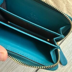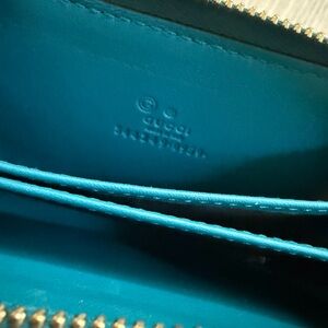 Brand new with box Elegant Gucci wallet in turquoise leather. Features zip-around design.