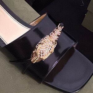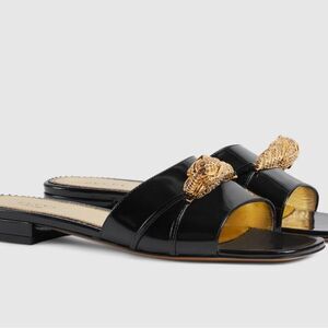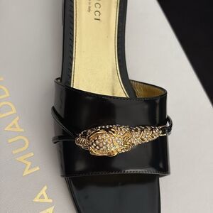 Gucci WOMEN'S SLIDE SANDAL WITH gold HARDWARE size~6 Elegant black slide sandals featuring gold accents. Perfect for adding a touch of luxury to any outfit.With a defined block heel, this slide sandal is introduced with the House's snake head hardware in gold-toned metal. Presented in black patent leather, this style is enhanced by the timeless silhouette.