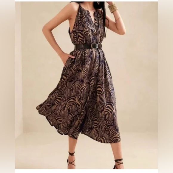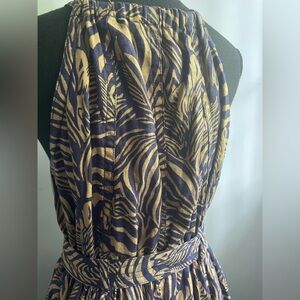 Chic midi dress with a zebra pattern in navy and beige. Features a halter neckline and button closure on the blouse. Matching belt is included. The dress is lined. Pit to pit is approximately 16.5 inches and the buttons can remain open for a more revealing fit.