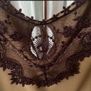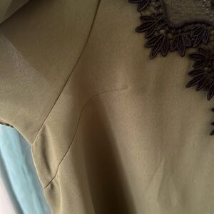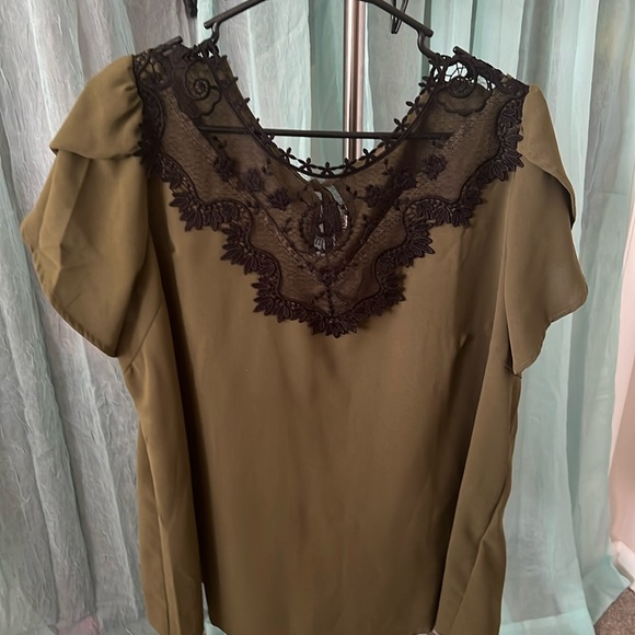 This beautiful silky top is brand new without tags. It has been washed but never worn. So pretty for fall, it is an army/olive green shirt with black lacing with tulip sleeves.